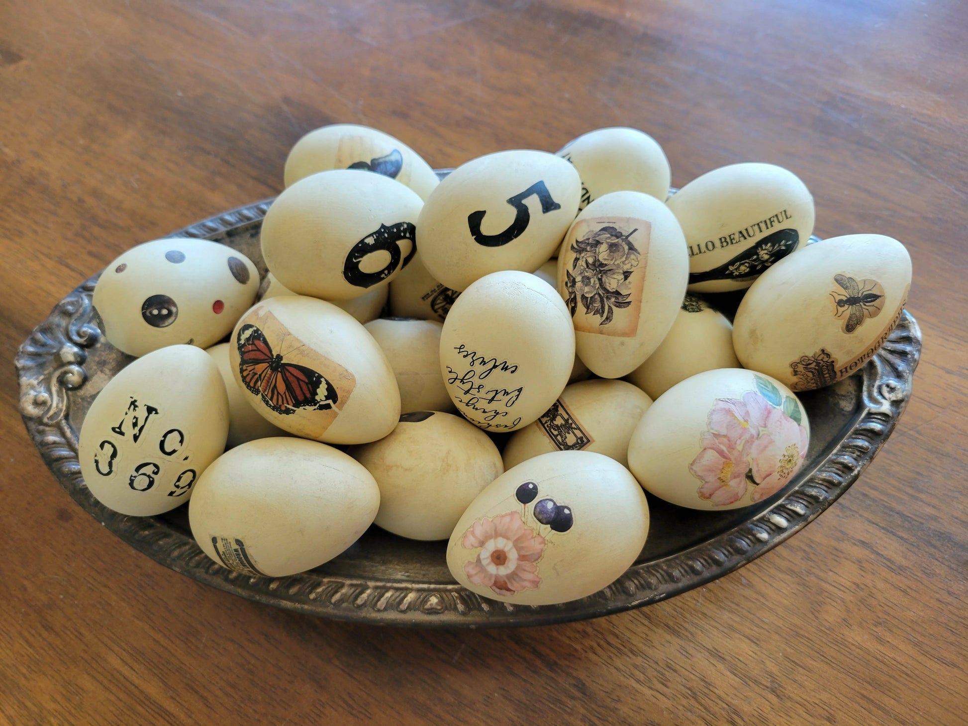 Beautifully decorated eggs to display in a bowl or on on a tiered tray. Styles vary, so collect several!!
